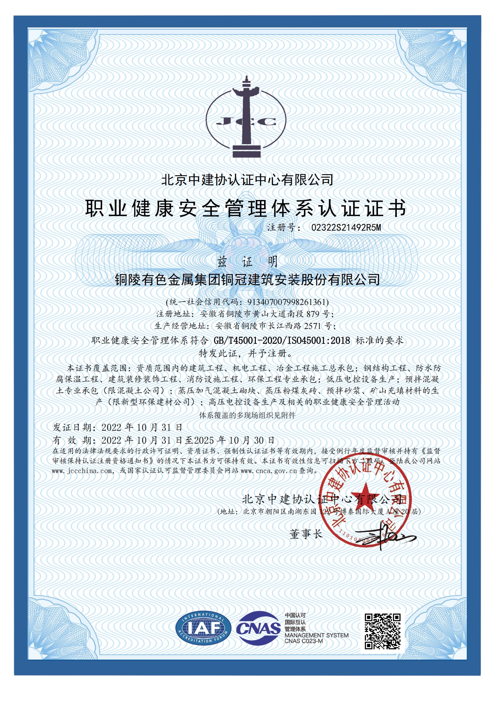 職業(yè)健康安全管理體系認(rèn)證證書